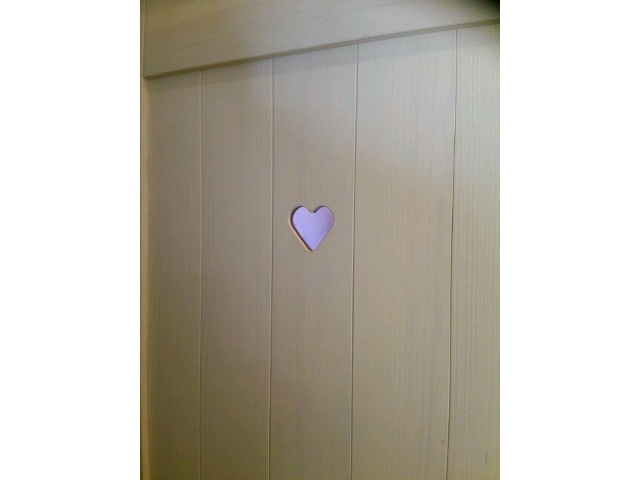 トイレの入り口にはハートの窓をつけました。こちらも洗面所と同様、誰かが入っていると明かりが見える仕様です。中がはっきり見えることはありませんので、安心です。