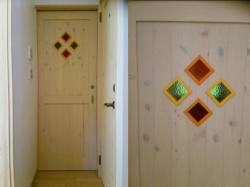 洗面所の入り口の扉に、かわいいダイヤのデザインを施しました。色の入ったガラスなので、誰かが使用していればわかるし、また中の様子がはっきり見えることはありません。