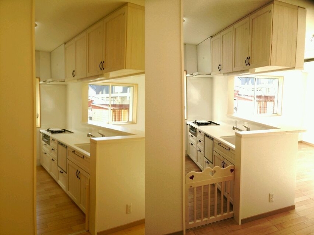※写真2枚目:キッチン(右の写真は開閉式飾り柵です)