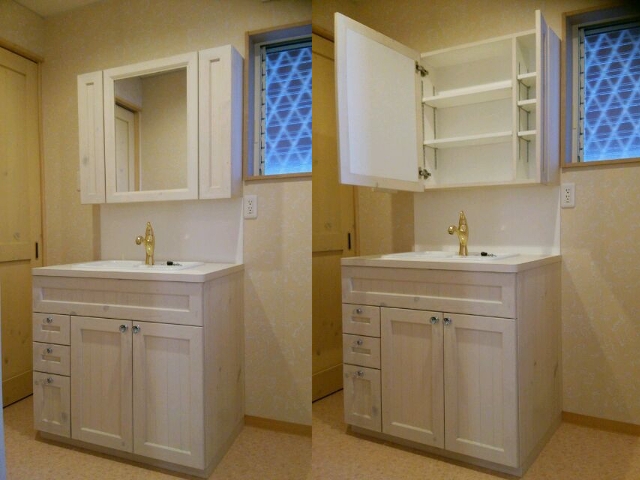 ※写真2枚目:洗面化粧台(左:戸棚が閉じている状態 右:戸棚が開いている状態)